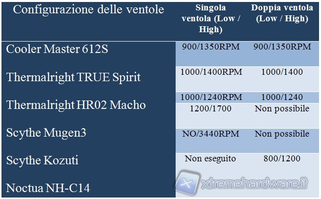 Abbiamo scelto di utilizzare come CPU un Core i7 920 revisione D0 in quanto permette di stressare in modo adeguato il dissipatore, grazie al suo TDP di circa 130W a default. Le temperature sono state confrontate con quelle del Noctua NH-C14, del nuovissimo Scythe Mugen3 e con il nuovo arrivato Scythe Kozuti, dei Thermalright HR02 Macho e con il nuovissimo TRUE Spirit. Riportiamo i dati effettivi di rotazione delle ventole, ricordando inoltre che sono sensibili ad una variazione del 10% quindi sono puramente indicativi. Differenze minime tra i regimi di rotazione sulla stessa ventola, non cambiano generalmente il risultato complessivo.