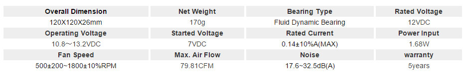 Il regime di rotazione minimo è di soli 500 RPM (con una rumorosità dichiarata di circa 18 dBA) e le GF120 a 12V fanno circa 1800 RPM con 32,5 dBA prodotti, ove riescono a generare un flusso d’aria di circa 80 CFM. La prestazioni dichiarate sulla carta ci mettono di fronte ad una ventola bilanciata, capace di coniugare prestazioni e silenziosità.