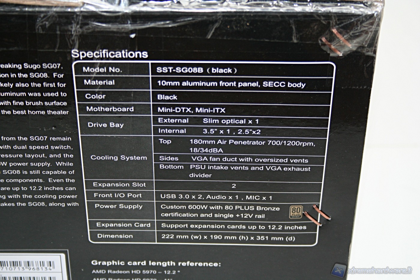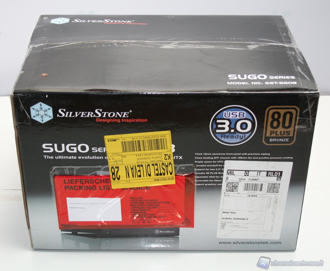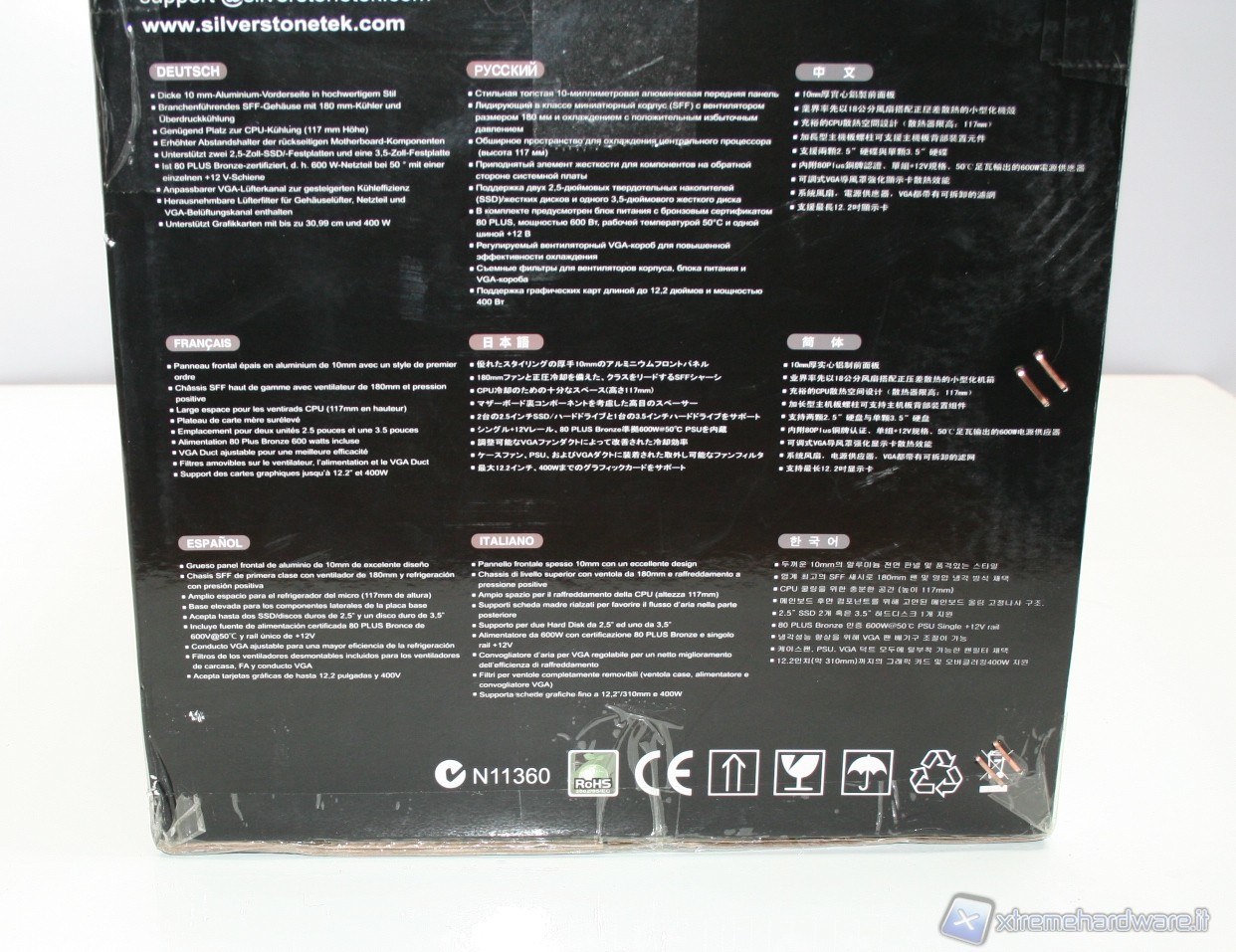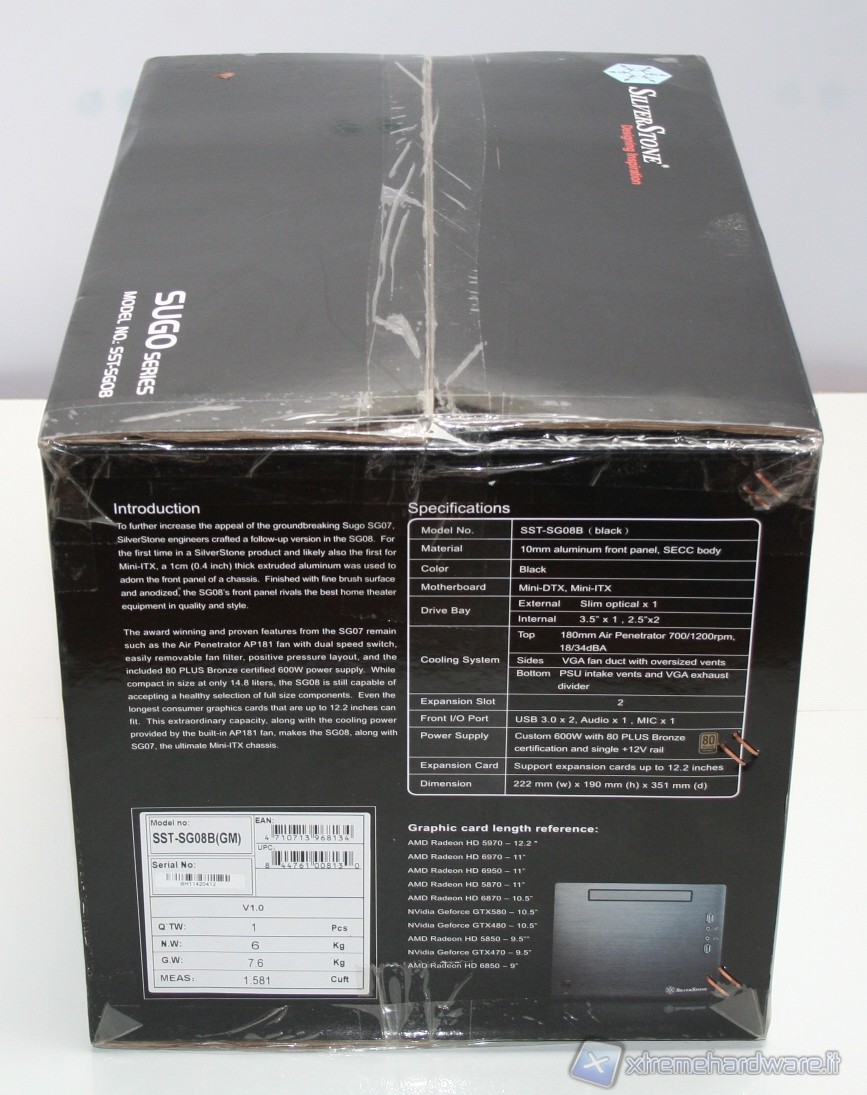 Il cabinet è stato imballato nel classico ed ottimo box SilverStone. Ottime le foto, molte le informazioni dettagliate e adeguata la descrizione dell’unità. All’interno il cabinet è al riparo da potenziali urti grazie a due gigantesche protezioni in polistirolo, cartone protettivo ed una grande busta di plastica contro graffi accidentali.